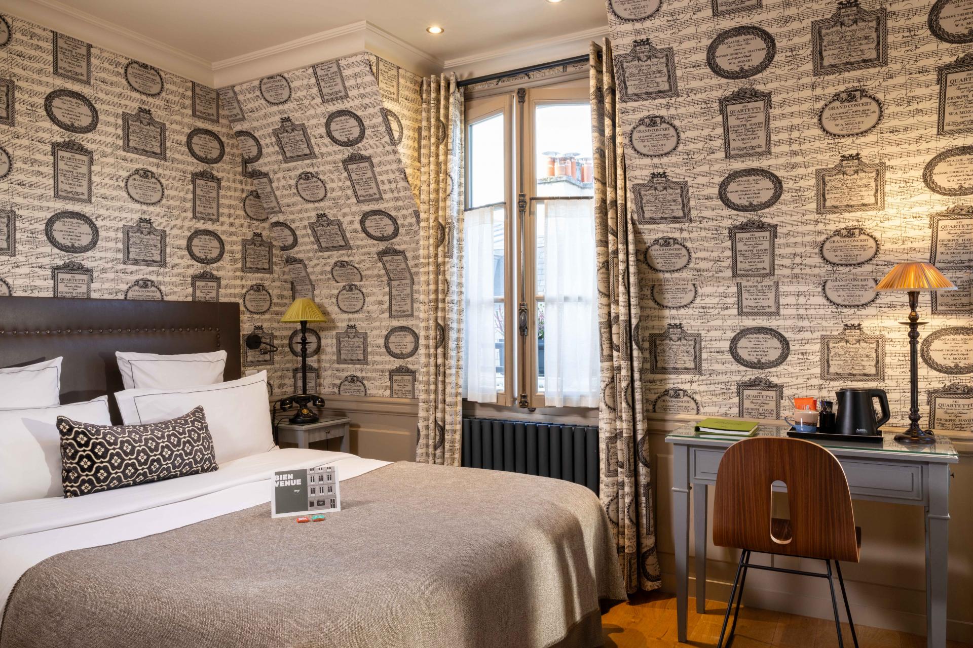 La acogedora habitación de los poetas, es la habitación más pequeña del hotel, con vistas a nuestro patio típicamente parisino, apreciará su calma y la optimización del espacio.